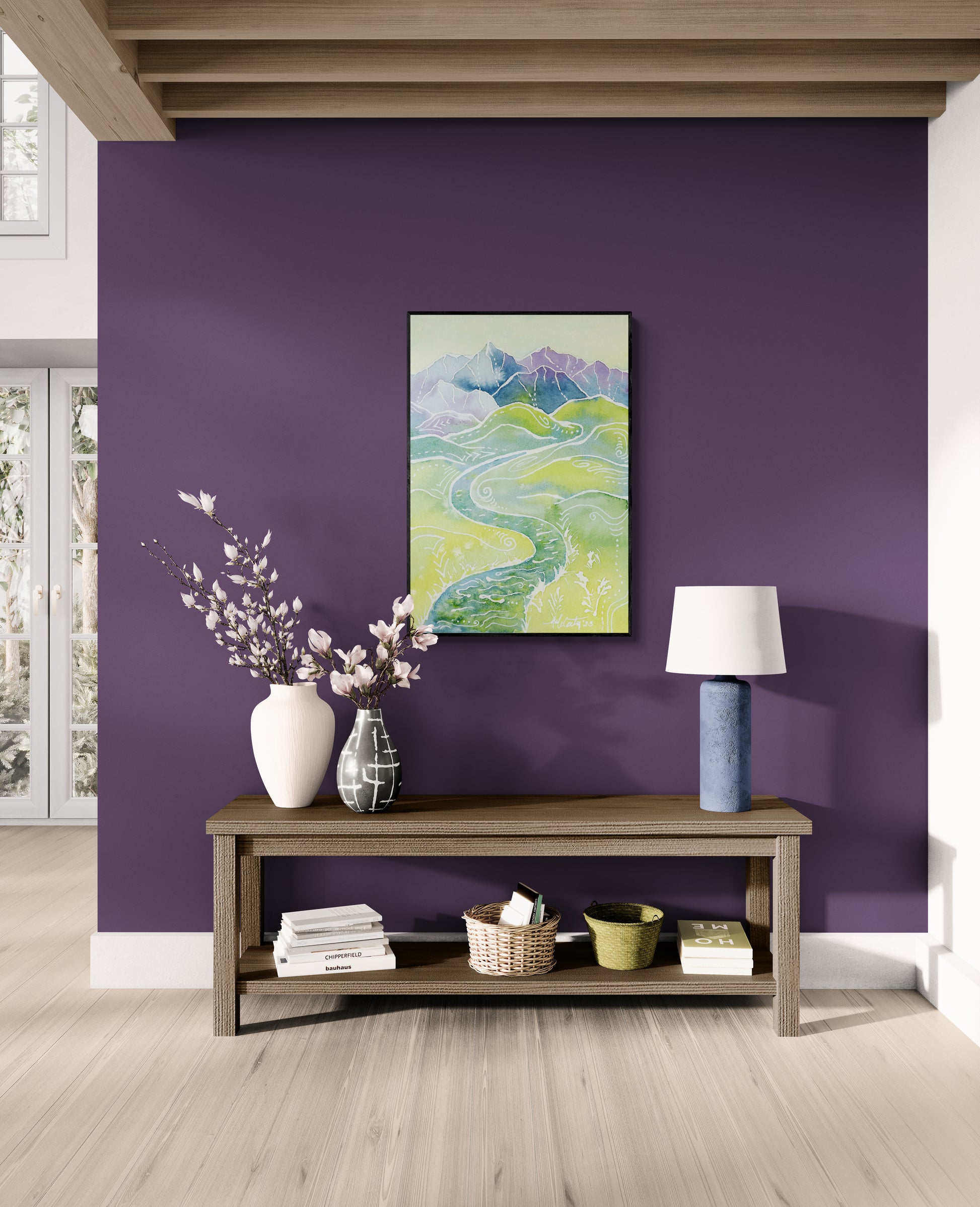 Immerse yourself in the serene beauty of "Crystalline Peaks," where calming contrasts of purples and golds evoke the whimsical charm of autumn. With its golden fields and majestic purple peaks, this artwork leads you into a state of flow, like the river. Let its tranquil hues remind you of the breathtaking beauty of fall and the awe-inspiring landscapes that surround us.