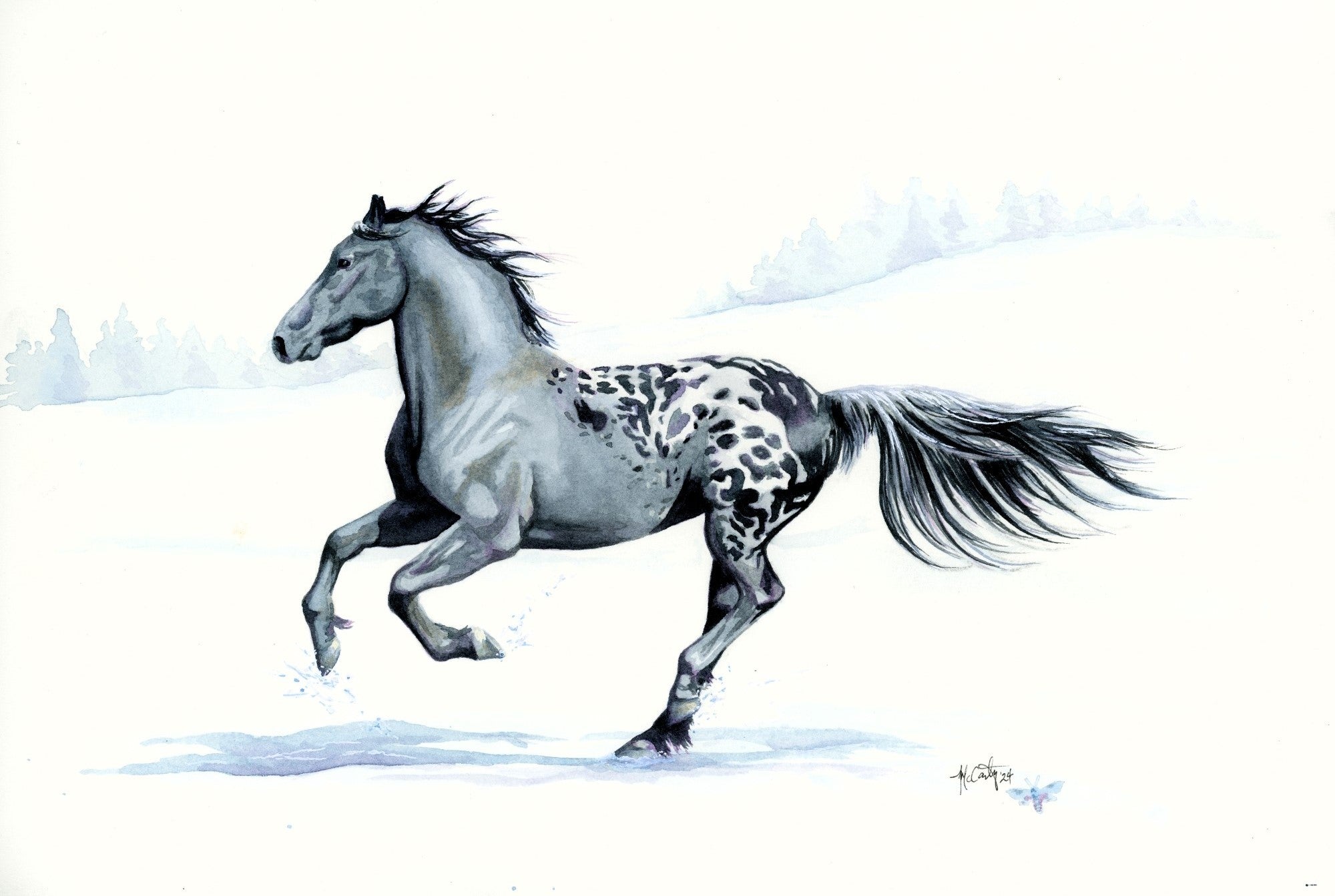 A custom piece of a Friesian-knabstrupper stallion from Perth, Australia. It was fun to envision him in snow. "I love it! He looks stunning" - Sandy