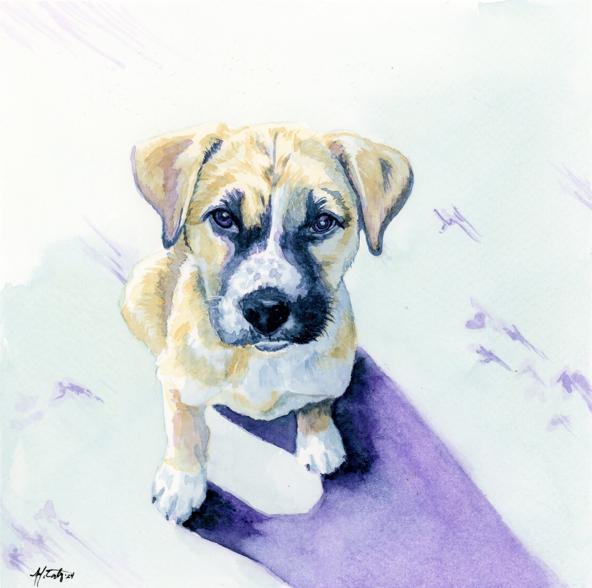 Rigley was a very special dog and actually one of my personal running buddies. This is a painting of him as a puppy on the day his family knew he was the one and brought him home. "Holy crap! It looks so good and you are far exceeding my expectations. Thank you so much!" - Mary