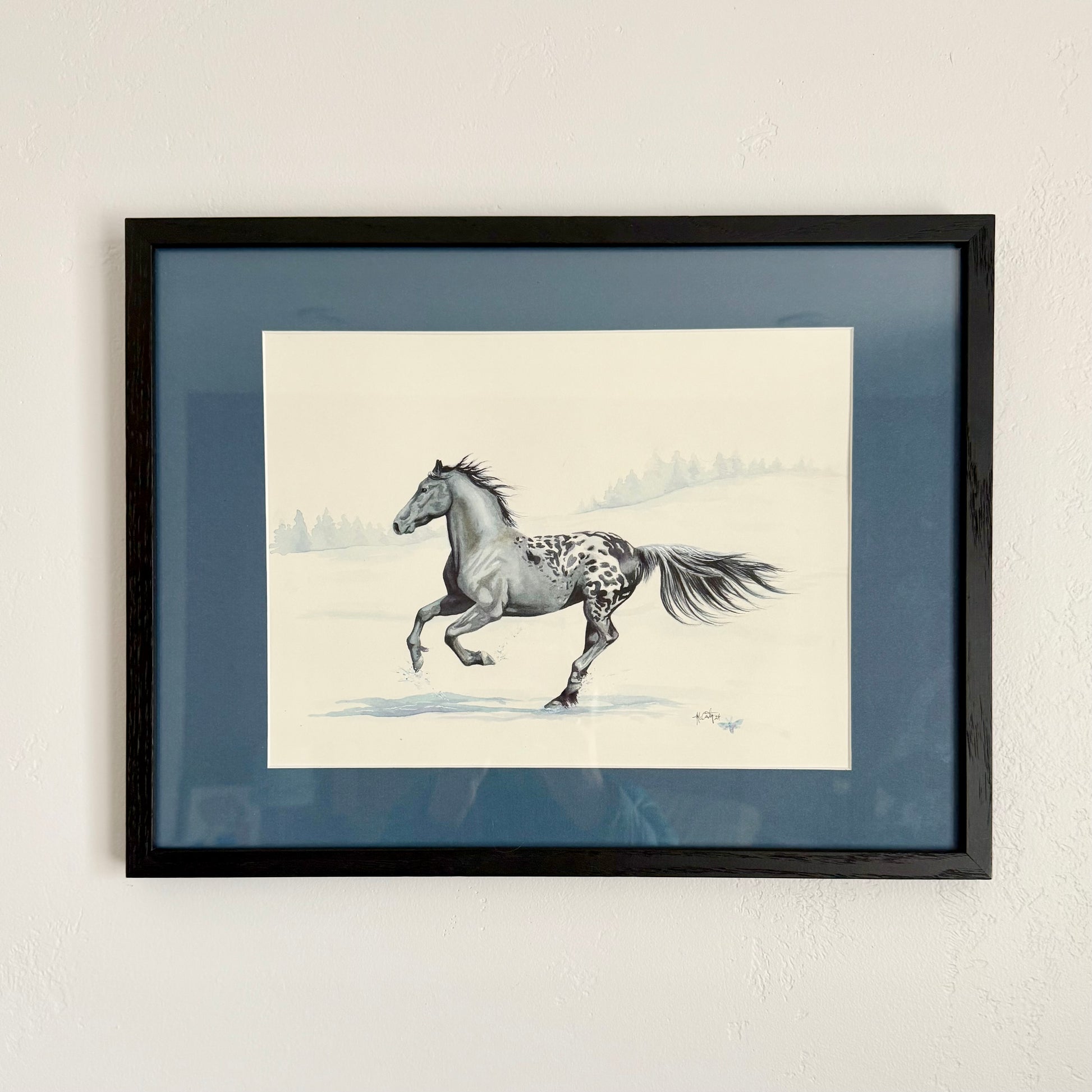 ‘Winter Warrior’ captures the essence of this legendary lineage, but with a twist. This striking Friesian-Knabstrupper stallion, painted in a snow-kissed landscape, embodies the beauty found when worlds collide. His deep, midnight coat—contrasted with the bold, speckled markings of his Knabstrupper heritage—creates a stunning fusion of tradition and transformation. Nearly lost during the Industrial Revolution, Friesians have reemerged as icons of power and grace, beloved both on the battlefield of history and on the silver screen. And they, too, can evolve with the times.